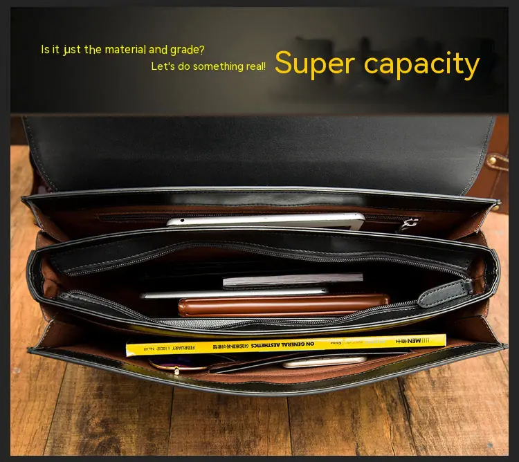 Product category: men's handbagStyle: Business CommuterSource category: spot Item no: 1117 Material: leather Bag shape: horizontal square Bag size: large Opening method: lock Bag internal structure: zipper pocket, mobile phone pocket, ID pocket, laminated zipper pocket, computer pocket Shoulder strap root number: single Processing method: soft surface Style: Men's handbag Color: black, coffee The latest delivery time: 3 days Size: 29 inch Applicable scene: business travel Applicable gender: male