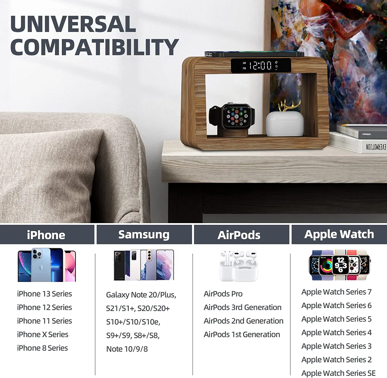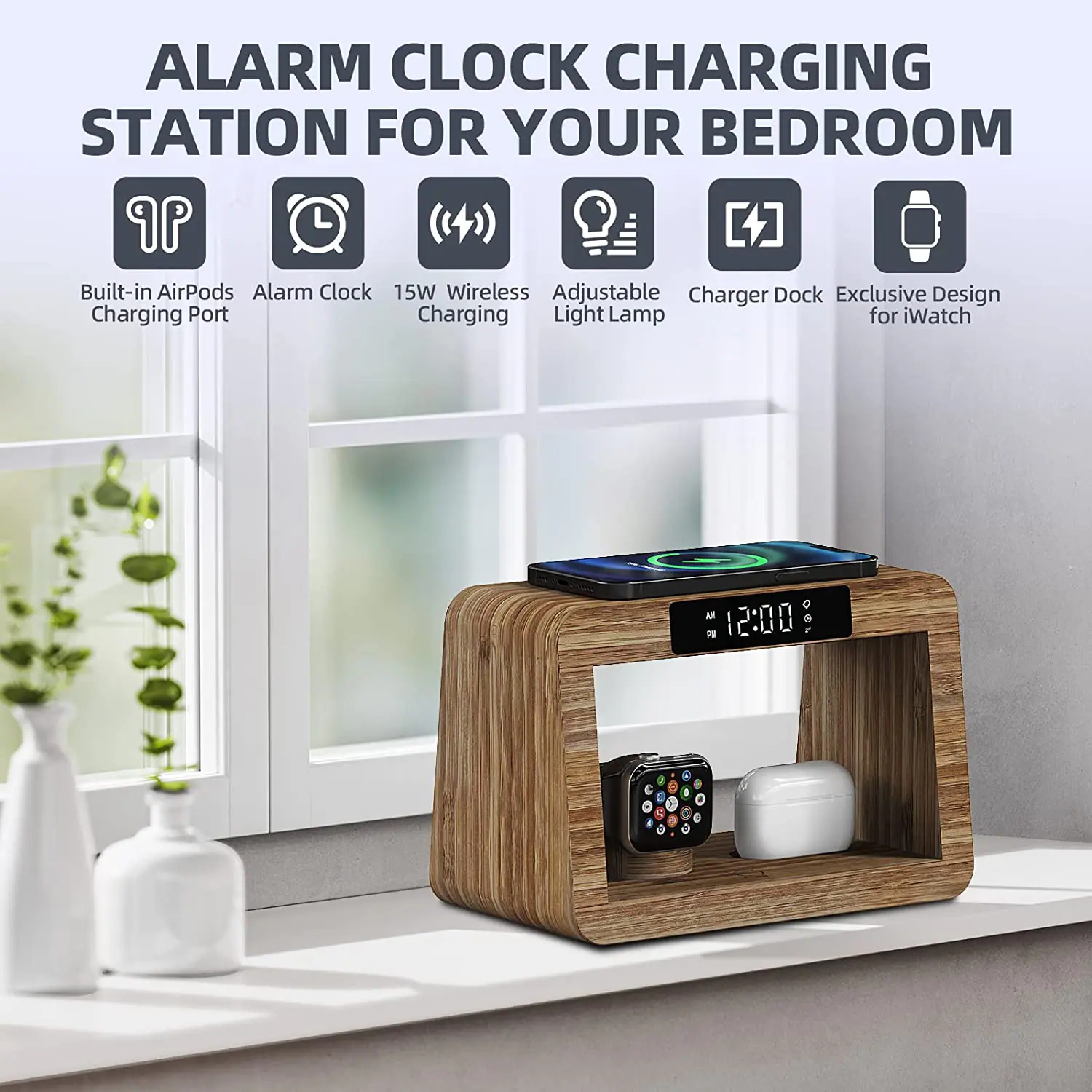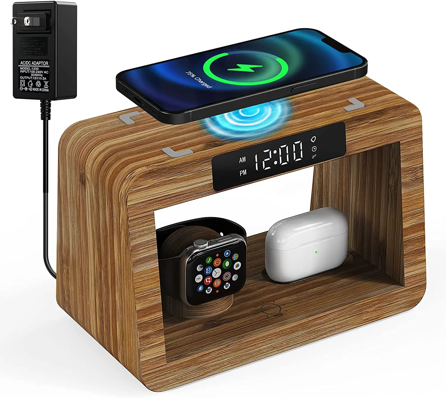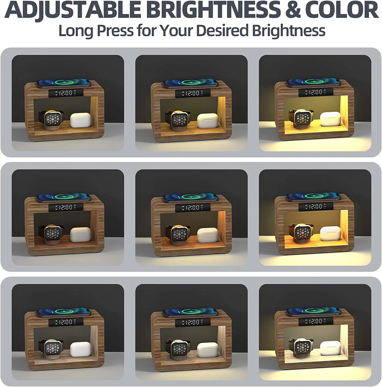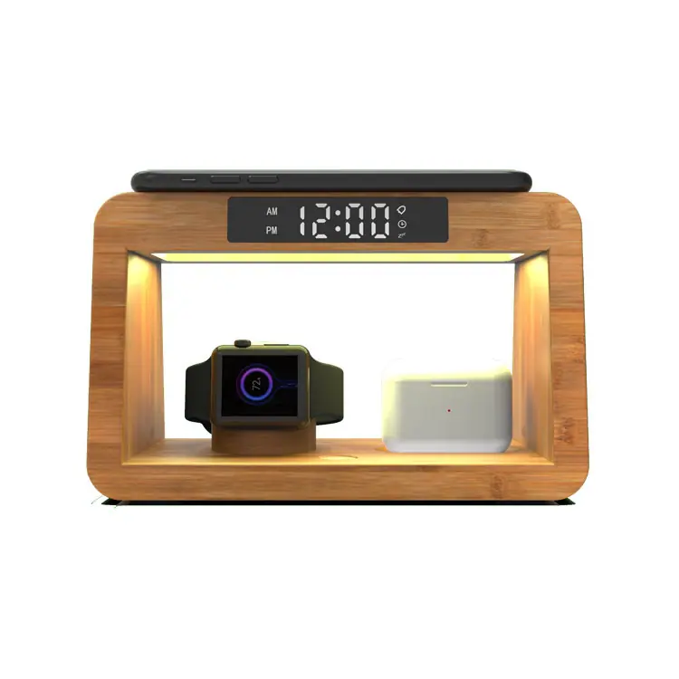 Functions: time display, alarm clock, desk lamp (cold and warm two-color stepless dimming) mobile phone wireless charging, Airpods earphone warehouse charging, smart watch charging
